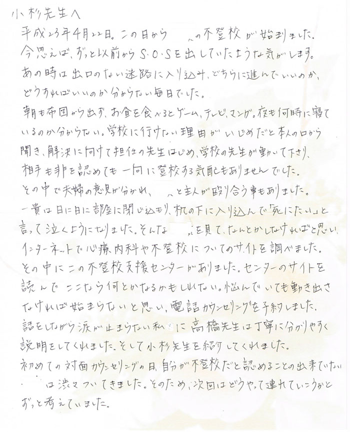 小杉先生へ平成23年4月22日。この日から○○の不登校が始まりました。今思えば、ずっと以前からS・O・Sを出していたような気がします。あの時は出口のない迷路に入り込み、どちらに進ん …